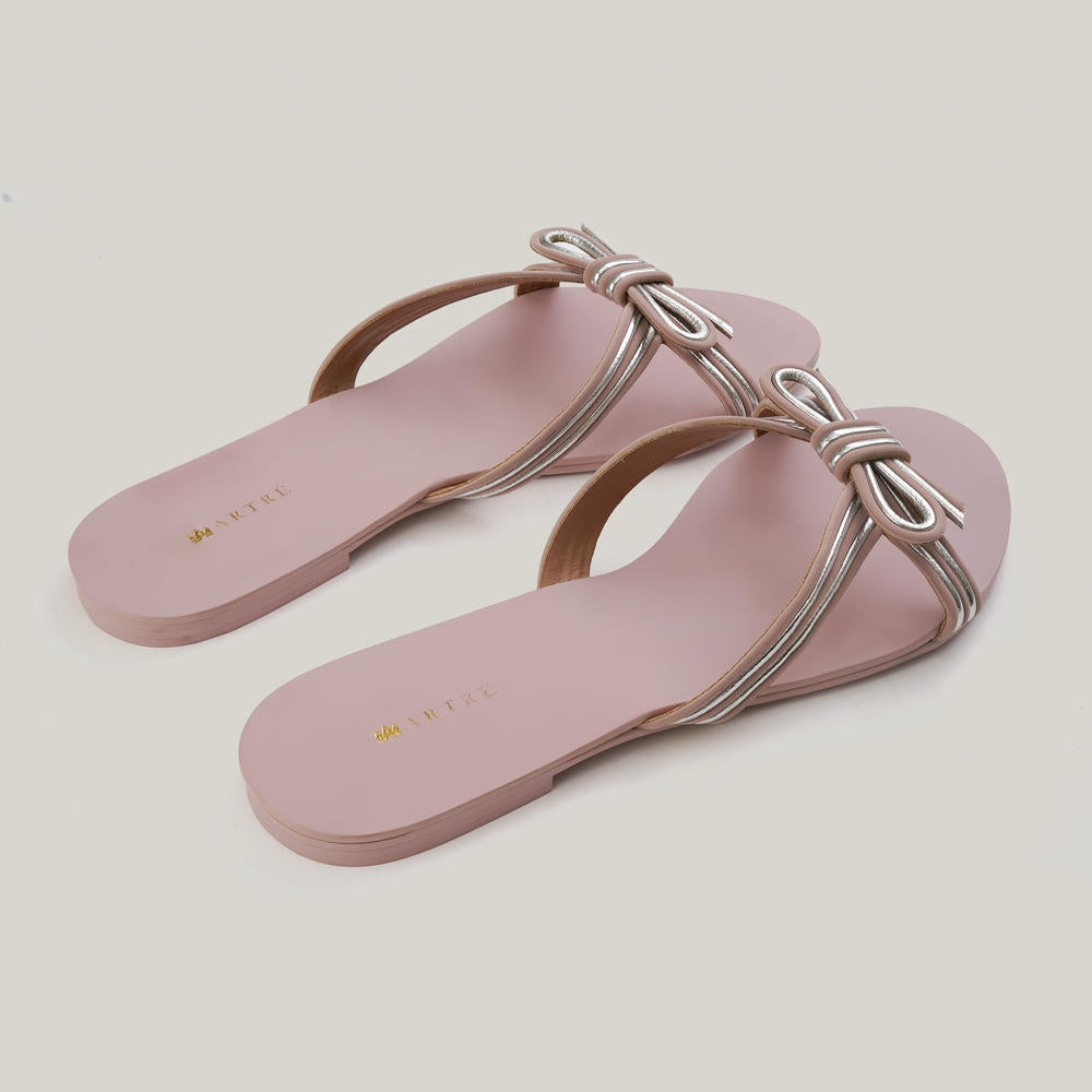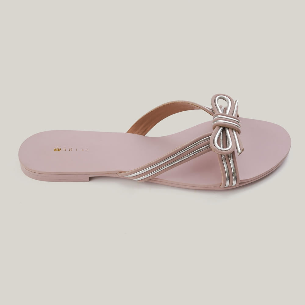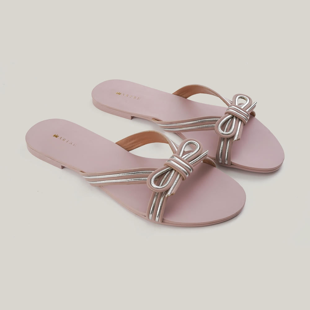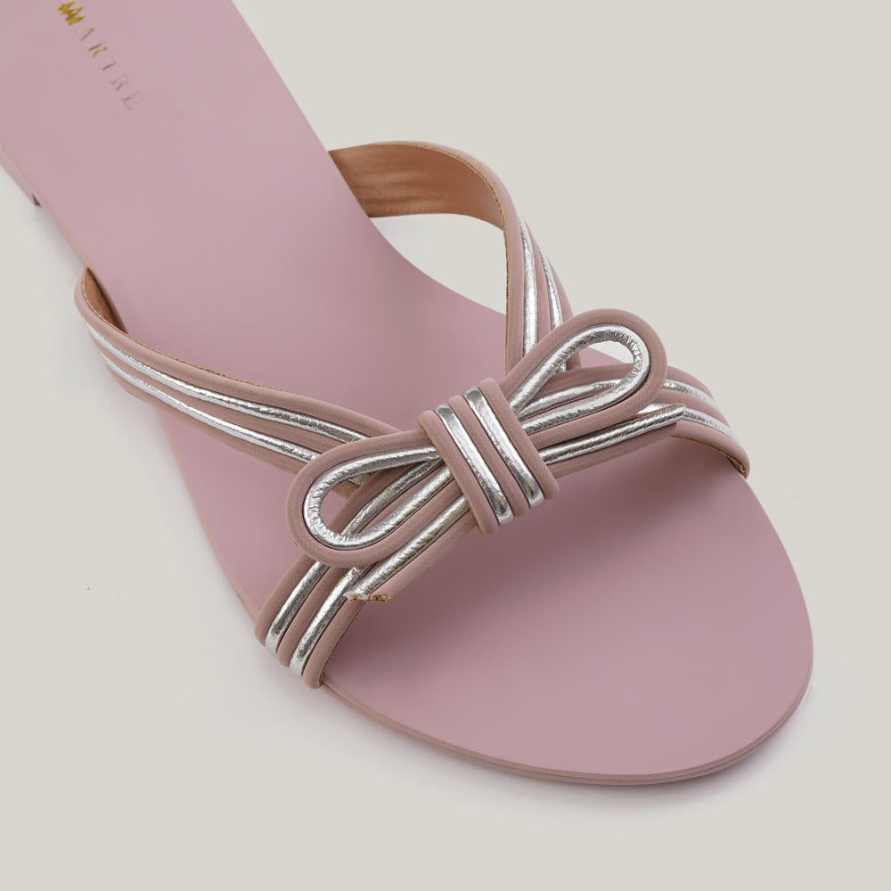 A study in harmony. Crafted with seamless continuity, the sole and insole mirror one another in tone and texture. The bow plays with contrast — shimmer intertwined with matte — creating a quiet elegance, tactile and timeless.